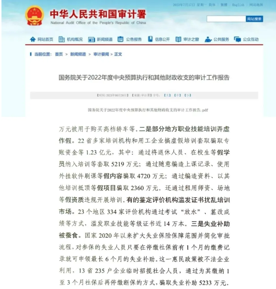 《国务院关于2022年度中央预算执行和其他财政收支的审计工作报告》部分内容截图