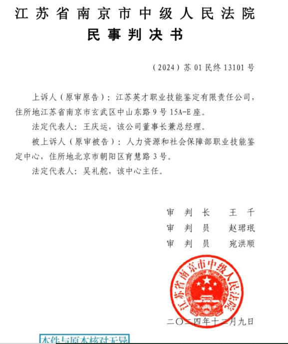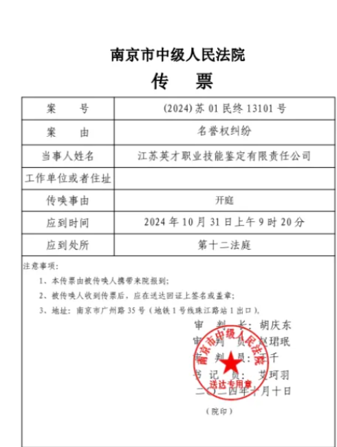 2024年8月30日,江苏省高级人民法院向江苏英才职业技能鉴定集团和JYPC全国职业资格考试认证中心送达(2024)苏民申4685号民事裁定书,确认:“英才公司的经营范围包括职业资格鉴定、技能证书发放,JYPC全国职业资格考试认证中心亦系英才公司的内设机构。”这份裁定书充分证明了以下事实:JYPC全国职业资格考试认证中心无论颁发职业资格证书,还是颁发职业技能等级证书,都在正常的经营范围内,完全合法合规。法院要求JYPC和社会大众包容侵权行为。